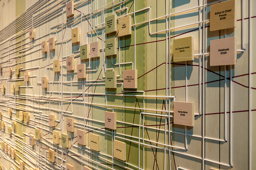 • In the first space the HOW presents De Zwarte Hond’s methods through a spatial installation of films and a live chart, revealing sources of inspiration, references, and ways of collaborating. The films explore craftsmanship, together, and the value of open space, while a network-style map traces the influences shaping the office’s work. As one, this “cloud” of ideas shows how the studio shares knowledge, passes it on, and reflects critically on its projects.